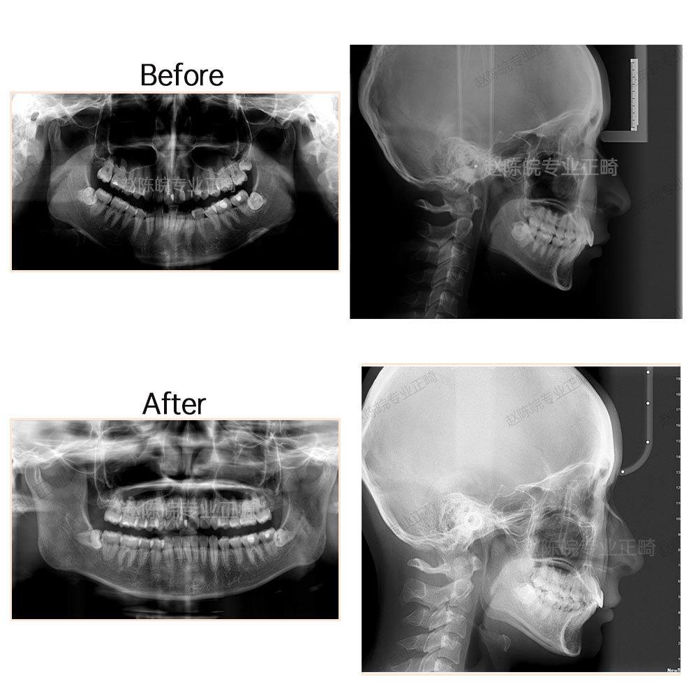 ?矯正前后X線片前后對(duì)比圖(觀察對(duì)比側(cè)面顱骨情況及牙體牙周情況)