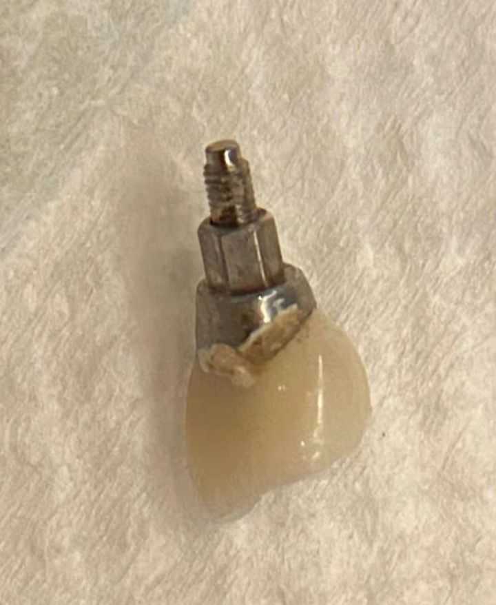 下面這組案例,種植牙修復(fù)冠破損,拆卸后,頸部有一片粘接劑。