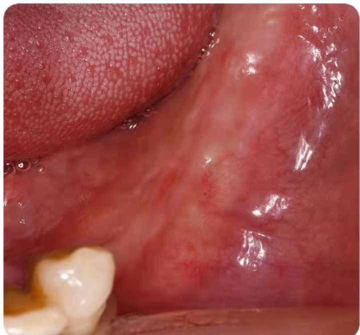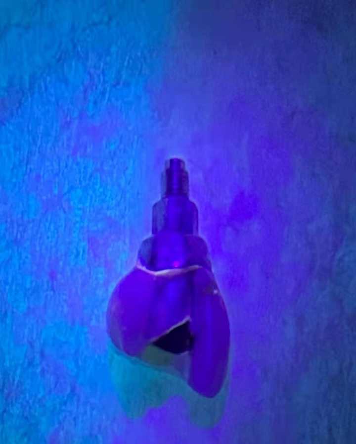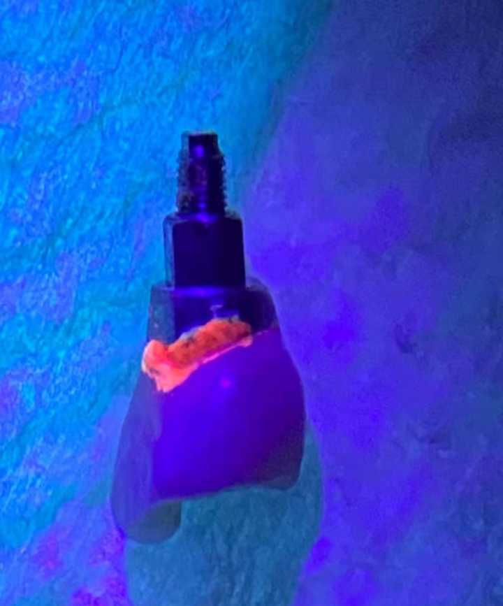 激光筆照射后,發(fā)出粉色熒光,這說明有細(xì)菌感染。粘接劑殘留,是一個(gè)嚴(yán)重的菌斑滯留因素。一般的種植醫(yī)生不懂修復(fù),可能會(huì)出現(xiàn)這種問題。