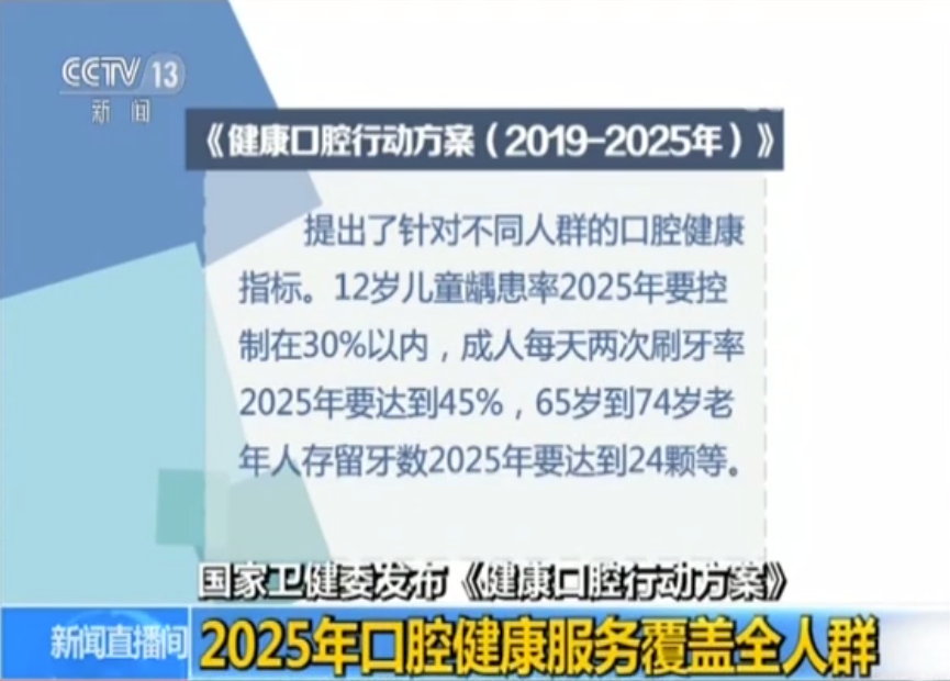 日前,衛(wèi)健委發(fā)布了《健康口腔行動(dòng)方案(2019-2025年)》,其中明確表明,到2020年,我國(guó)青少年、中老年人等重點(diǎn)人群口腔保健水平穩(wěn)步提高。到2025年,人群口腔健康素養(yǎng)水平和健康行為形成率大幅提升,口腔健康服務(wù)覆蓋全人群、全生命周期。
