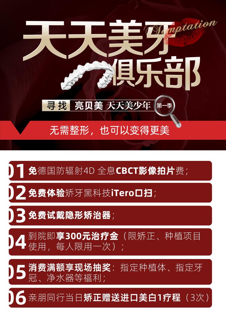 據(jù)悉,亮貝美口腔醫(yī)院近日推出了"天天美牙俱樂部尋找天天美少年(第一季)"限時(shí)報(bào)名活動(dòng),如果您或您身邊的朋友正在被牙齒畸形或面型問題困擾,可以點(diǎn)擊閱讀原文鏈接報(bào)名預(yù)約,限量領(lǐng)取以下福利: