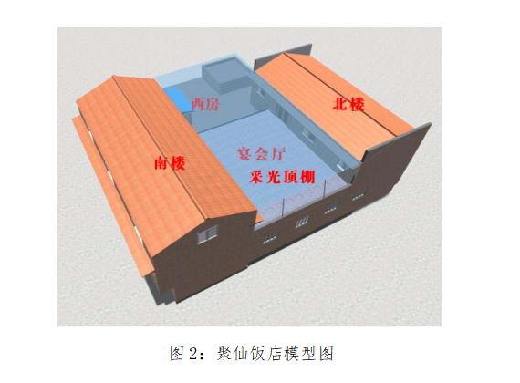 (一)飯店概況。聚仙飯店由襄汾縣陶寺鄉(xiāng)陳莊村村民祁建華經(jīng)營,位于該鄉(xiāng)陳莊村西、陶云線道路北側(北緯35°53′45.78″,東經(jīng)111°31′03.73″),是祁建華在其家庭承包責任田上自建的農(nóng)村兩層建筑物,占地面積1146.09m2(含北側院落,合1.72畝),建筑總面積1157.05m2(含鋼結構采光頂棚面積),投資共約39萬元。建筑結構總體為磚混結構,局部為框架結構,主要組成部分為南樓、北樓、西房、宴會廳及鋼結構采光頂棚。建筑物功能:宴會廳和北樓一層用于飯店經(jīng)營,西房為廚房,南樓二層、北樓二層為居住用房,南樓一層為雜物房(聚仙飯店模型圖見圖2)。該飯店初于1995年開始營業(yè),2003年重新辦理了營業(yè)執(zhí)照,接待了半年散客之后,經(jīng)營模式調整為只承接各類宴席,大接待能力為27桌約200人。廚師為祁建華家人,承接宴席時臨時聘用服務員。