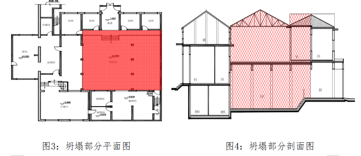 事故坍塌部分為宴會廳、北樓二層南半部分和鋼結構采光頂棚,坍塌部分房屋建筑面積為252.59m2。(坍塌部分平面圖見圖3、坍塌部分剖面圖見圖4)