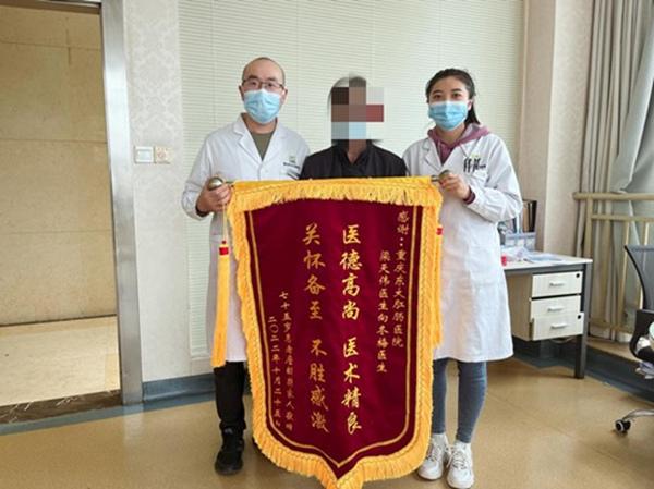 近日,75歲詹婆婆將一面寫(xiě)有“醫(yī)德高尚醫(yī)術(shù)精良,關(guān)懷備至不勝感激”的錦旗,送到重慶東大肛腸醫(yī)院醫(yī)生梁天偉和醫(yī)助向冬梅手中,以此表達(dá)對(duì)全體醫(yī)護(hù)人員的衷心感謝。