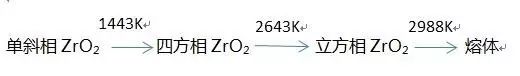 氧化鋯在不同條件下有三種不同的晶型存在:立方相(c-ZrO2),密度6.27g/cm3,四方相(t-ZrO2),密度6.10 g/cm3和單斜相(m-ZrO2),密度5.65g/cm3。以上3種晶型存在于不同的溫度范圍,并可以相互轉(zhuǎn)化[1]。它們分別在2643K以上、1443~2643 K之間和小于 1443 K 溫度范圍內(nèi)穩(wěn)定。