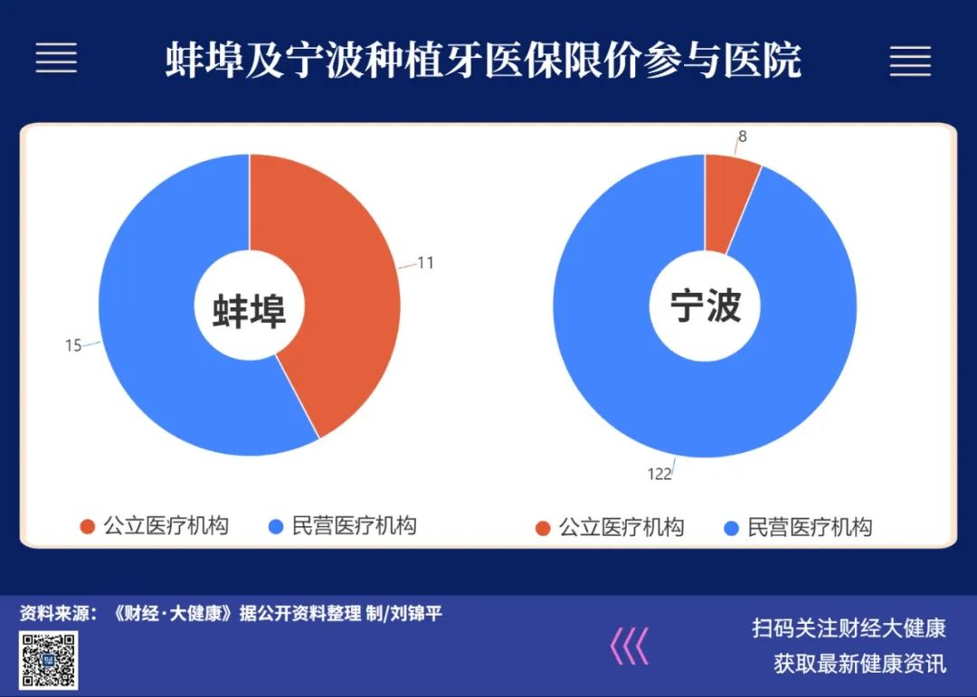 《財經(jīng)·大健康》梳理發(fā)現(xiàn),此次參與蚌埠種植牙限價的醫(yī)院中,公立醫(yī)院11家,民營機(jī)構(gòu)為15家;寧波則為公立醫(yī)院8家,民營機(jī)構(gòu)為122家。