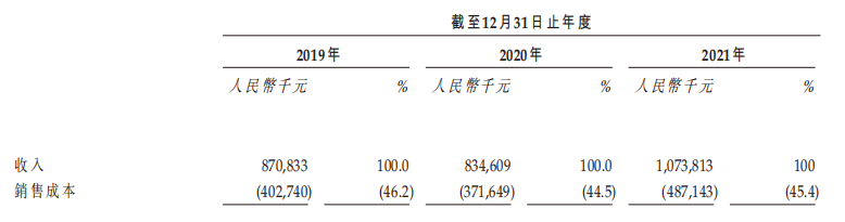 從招股書(shū)來(lái)看,從2019年~2021年,其銷(xiāo)售成本占總營(yíng)收的46.2%、44.5%與45.4%,如此之大的銷(xiāo)售成本,不禁使人疑惑錢(qián)都花去哪里了?