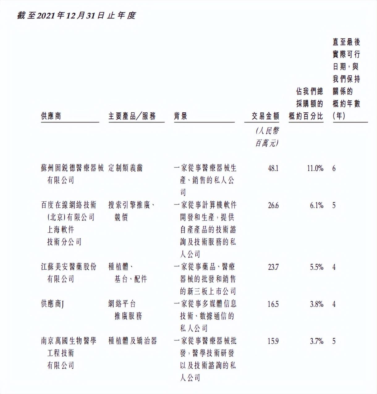 從其招股書(shū)中所羅列的五大供應(yīng)商來(lái)看,作為一家重點(diǎn)業(yè)務(wù)在種植牙與矯正牙齒的口腔服務(wù)行業(yè),百度近三年卻一直是集團(tuán)的前三供應(yīng)商,2021年的競(jìng)價(jià)費(fèi)用持續(xù)上漲,花了2660萬(wàn)元,使得百度成為其年度第二大供應(yīng)商。并且,2021年前五大供應(yīng)商中還出現(xiàn)了另一家未披露的廣告供應(yīng)商。