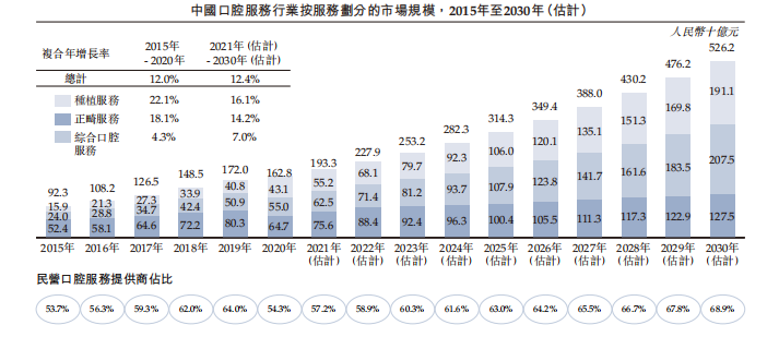 根據(jù)灼識(shí)咨詢(xún)報(bào)告,中國(guó)口腔服務(wù)行業(yè)的市場(chǎng)規(guī)模持續(xù)擴(kuò)大,由2015年約923億元增加至2020年的1628億元,年復(fù)合增長(zhǎng)率為12%,并且預(yù)計(jì)到2030年將達(dá)約5262億元,年復(fù)合增長(zhǎng)率達(dá)12.4%。