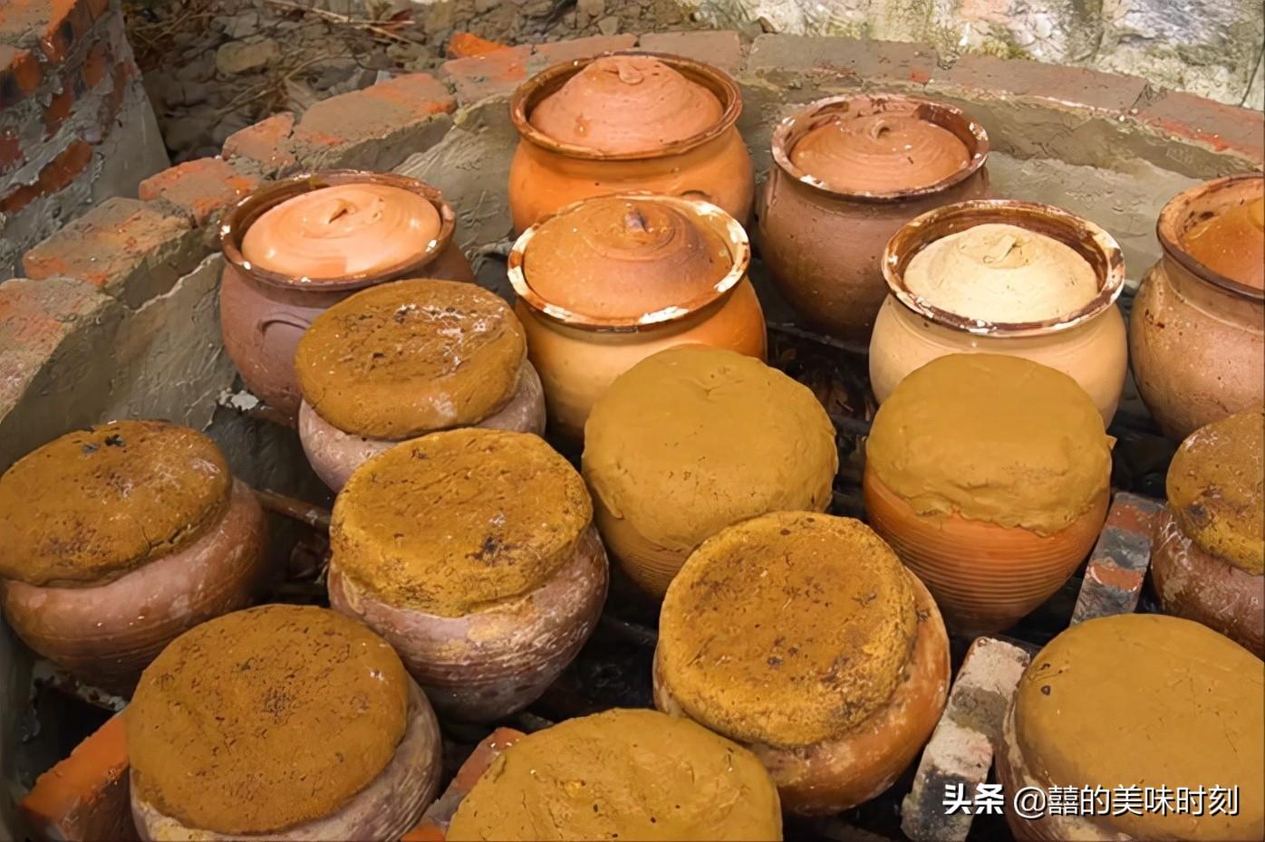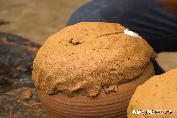 做法講究雞殺好后用泉水洗凈,先放到一個寬口的陶盆里,加點米血、內(nèi)臟,以及他家的招財樹——秘方的醬汁,再放許多姜片和別的配料,混合均勻,然后再準(zhǔn)備用來烤雞的瓦罐底部墊上姜片,它的作用一個是去腥,再一個是能防止底部的雞肉烤糊粘鍋;將混合著藥材的雞肉全部放進(jìn)瓦罐里,罐口依次蓋上荷葉、蓋子、錫箔紙,后用泥封好,就可以放進(jìn)烤窯里烤了。