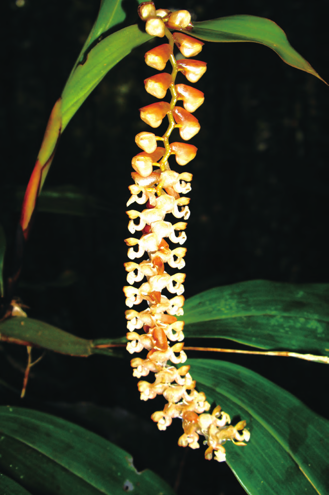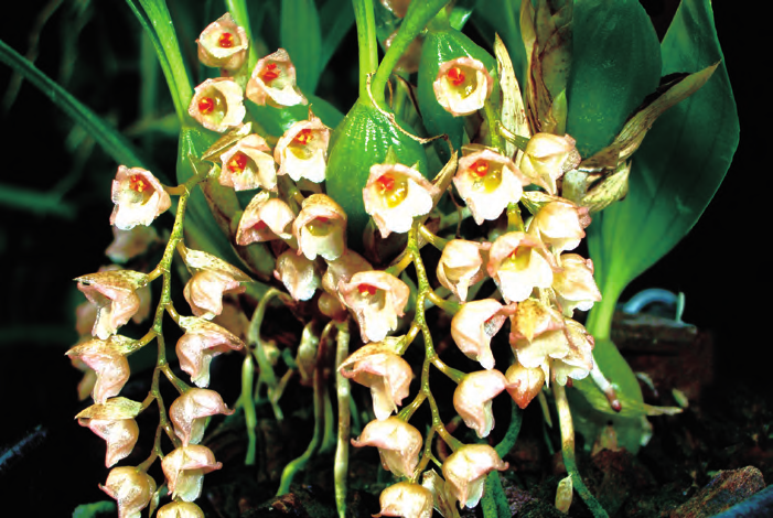 石仙桃為附生或石生,根狀莖粗壯,具匍匐狀,葉革質(zhì),狹橢圓形、卵形或長(zhǎng)圓形,總狀花序具密生穗狀多花,花白色、粉紅色、淺褐色、淡綠色、淡黃色或淺玫瑰色。4 ~ 5 月或7 ~ 10 月。