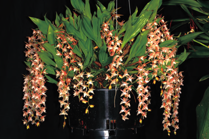 肥料 石仙桃比較喜肥,但忌施高濃度肥料。一般每個(gè)主分枝每年僅長(zhǎng)出1 個(gè)新假鱗莖,因此在旺盛生長(zhǎng)期間,建議施用水溶性肥料和緩釋肥料兩種,以其培養(yǎng)出肥大的球莖。石仙桃對(duì) N、P、K 的需求不同,一般馴化苗栽種 1 周后,用花寶 1 號(hào) 4000 ~ 5000倍液噴淋透基質(zhì) 1 次,隔 3 天再淋施 1次。1 ~ 3 周后,根據(jù)小苗干濕情況隔5 天稀釋 3000 ~ 4000 倍液進(jìn)行噴淋施1 次。當(dāng)幼苗開(kāi)始長(zhǎng)葉后,小苗階段用N、P、K 比例為 2 ∶ 1 ∶ 1 的水溶性復(fù)合肥料,如花寶 5 號(hào)、花多多 10 號(hào),濃度為 3000 ~ 4000 倍液,每 10 ~ 15天施用 1 次,并每 5 ~ 6 個(gè)月施用奧綠肥 5 號(hào)長(zhǎng)緩釋肥 1 次,以及每月 1 次噴施 3000 倍液的花多多 36 號(hào) TE 微量肥。中苗階段,則應(yīng)以 N、P、K 的比例 為 2 ∶ 1 ∶ 1 和 1 ∶ 1 ∶ 1 兩 種 肥料 2000 ~ 3000 倍液交替施肥,每隔7 ~ 10 天施用 1 次,如花寶 5 號(hào)、花寶2 號(hào)、花多多 10 號(hào)、花多多 1 號(hào),并每 3 ~ 4 個(gè)月施用奧綠肥 301 號(hào)長(zhǎng)控釋肥 1 次,以及每月噴施 3000 倍液的花多多 36 號(hào) TE 微量肥 1 次。大苗階段,以 N、P、K 比例為 1 ∶ 1 ∶ 1 和1 ∶ 2 ∶ 2 的兩種肥料以 1000 ~ 2000倍液交替施用,每隔 7 ~ 15 天施 1 次,如 花 寶 2 號(hào)、 花 多 多 1 號(hào) 和 11 號(hào),并每隔 3 ~ 4 個(gè)月施用奧綠肥 601 號(hào)(10-11-18+2MgO+TE)1 次, 每 月 繼續(xù)噴施 1 次 3000 倍液的花多多 36 號(hào)TE 微量肥。在進(jìn)入花芽生長(zhǎng)期,應(yīng)改施用以 N、P、K 比例為 1 ∶ 3 ∶ 2 為主的肥料,如花寶 3 號(hào)或花多多 2 號(hào)1000 ~ 2000 倍液的濃度每周淋施 1 次,直至抽出花梗時(shí)停止施肥?;ê笠鶕?jù)季節(jié)施肥,建議在夏末和秋季使用低氮高磷的肥料,以促進(jìn)下一季更好地開(kāi)花,并使新長(zhǎng)出的假鱗莖在冬季前變硬成熟。