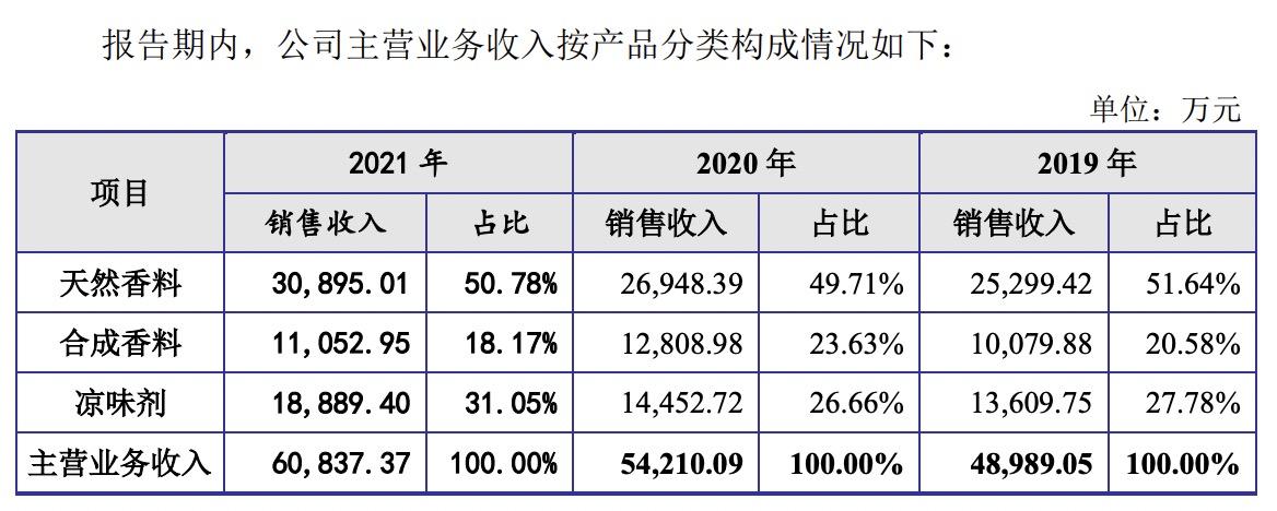 這些快消品牌主要用到的是亞香香料的涼味劑。2021年,亞香香料涼味劑的總銷售收入達(dá)1.49億元,占比達(dá)到31.5%,僅次于天然香料,是合成香料的兩倍。