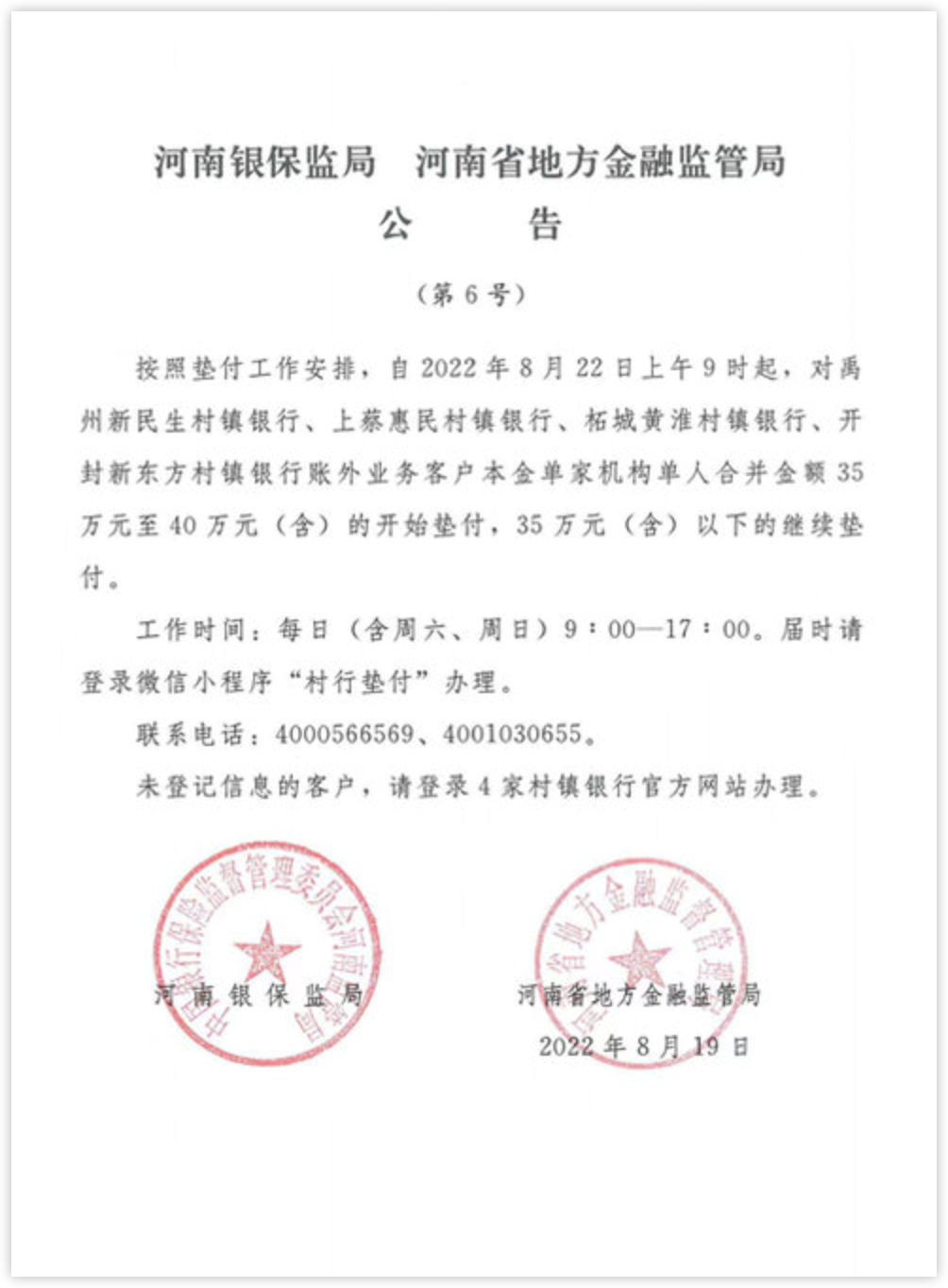 6.河南對村鎮(zhèn)銀行35萬至40萬客戶開始墊付:19日,河南銀保監(jiān)局、河南省地方金融監(jiān)管局發(fā)布公告,按照墊付工作安排,自8月22日9時起,對禹州新民生村鎮(zhèn)銀行、上蔡惠民村鎮(zhèn)銀行、柘城黃淮村鎮(zhèn)銀行、開封新東方村鎮(zhèn)銀行賬外業(yè)務(wù)客戶本金單家機(jī)構(gòu)單人合并金額35萬元至40萬元(含)的開始墊付,35萬元(含)以下的繼續(xù)墊付。(光明網(wǎng))