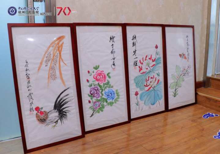 近,杭州口腔醫(yī)院城西院區(qū)李小鳳院長的診室里, 65歲的患者章大伯(化名)送來了四幅裝裱一新的國畫,畫中有彩蝶戀花,有公雞叫早,說起背后寓意,讓醫(yī)護(hù)人員們?yōu)橹畡尤荨?/p>