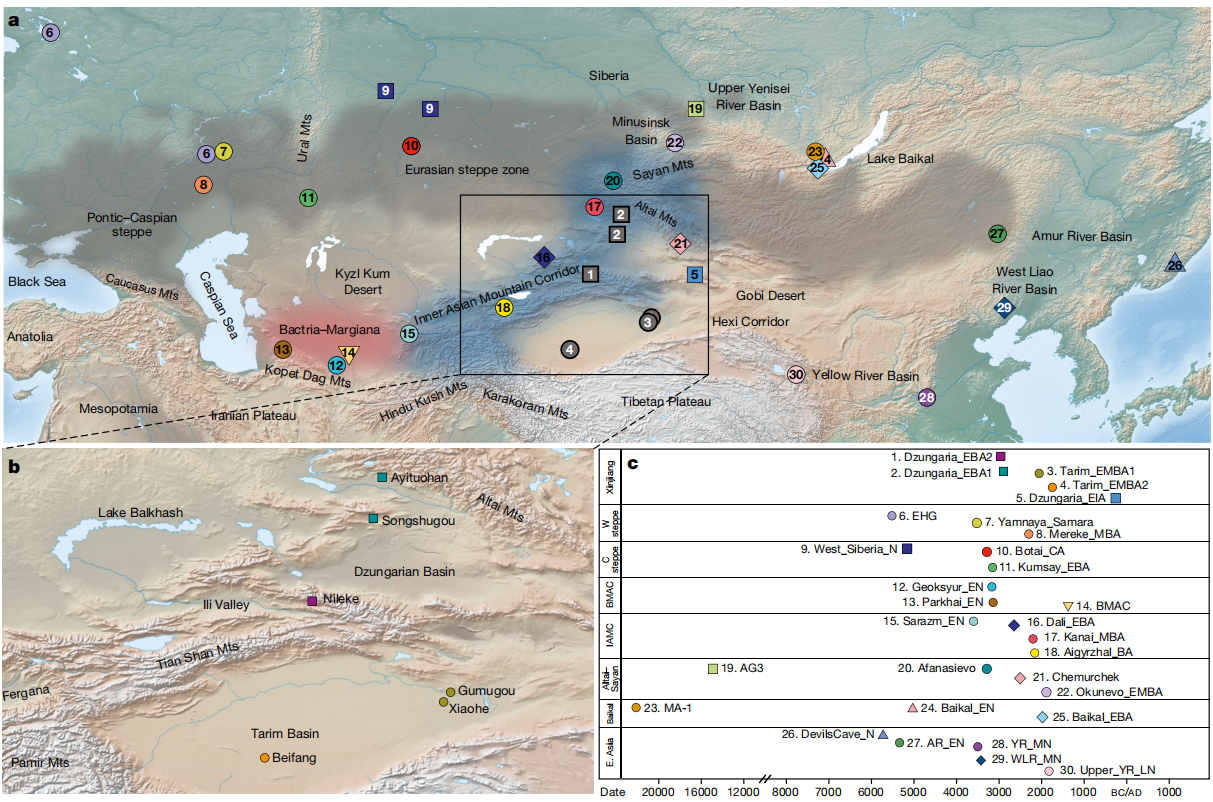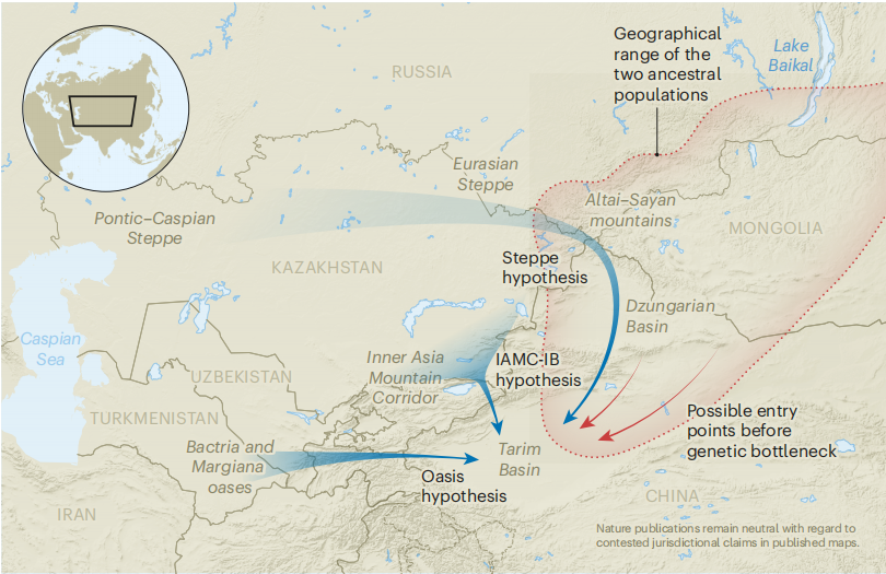 塔里木盆地早發(fā)現的干尸全基因組測序表明,塔里木盆地的干尸就是當地土著居民,其祖先屬于古北亞歐人。該先民的食譜主要是奶制品和小米、小麥等植物。同時,準噶爾盆地的干尸的祖先屬于西伯利亞草原的阿凡納謝沃人群。