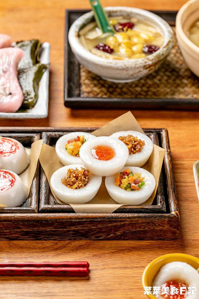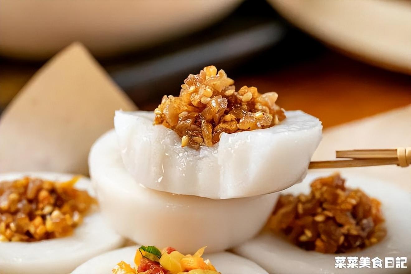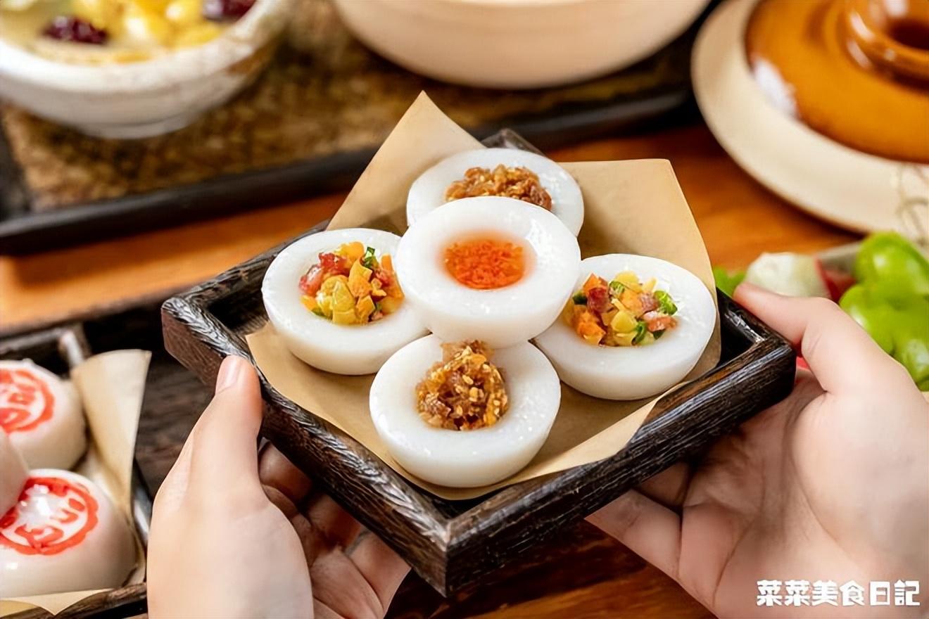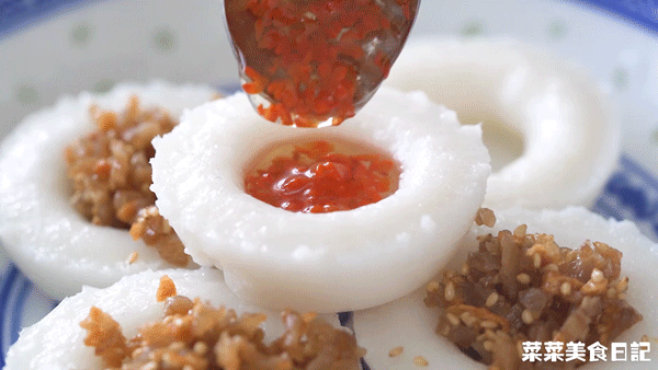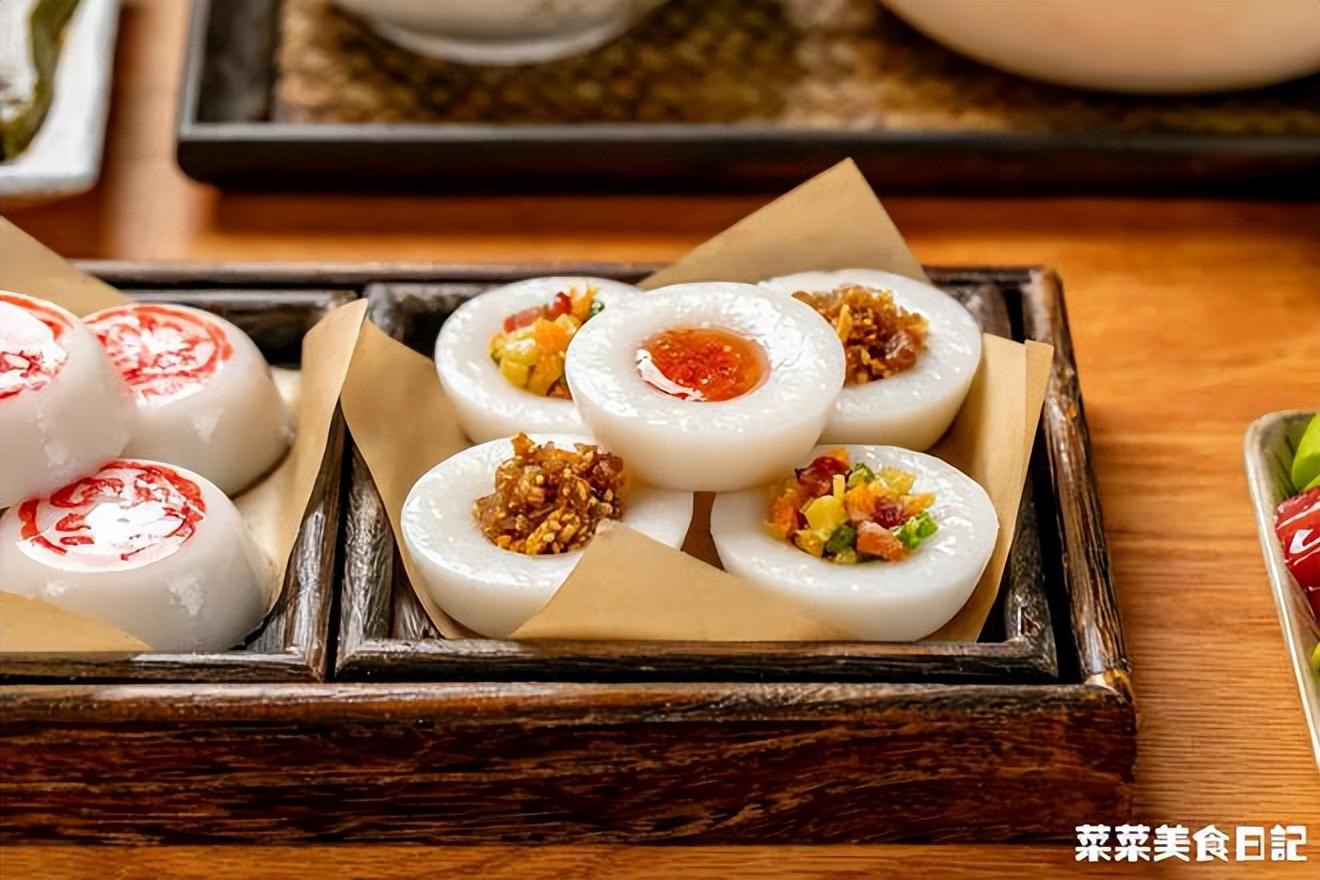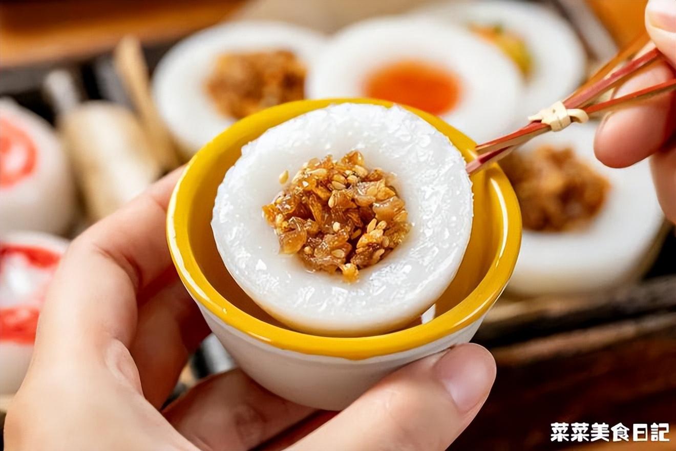 而水粿,則是白底做法,僅用純米漿來蒸,滋味都來自于各種咸甜澆頭。