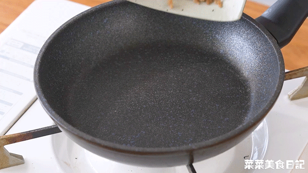 3.平底鍋放入菜脯丁小火炒干水分。放入2大勺蒜頭油小火煸炒出香味,后加1小勺糖、適量熟芝麻調(diào)味