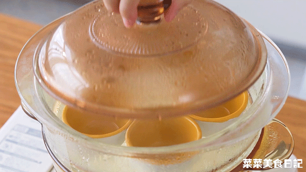 4.蒸鍋中放入耐高溫小碗蒸3分鐘,使小碗保持高溫。把靜置好的粉漿攪拌均勻,倒入小碗中至8分滿,大火蒸10分鐘