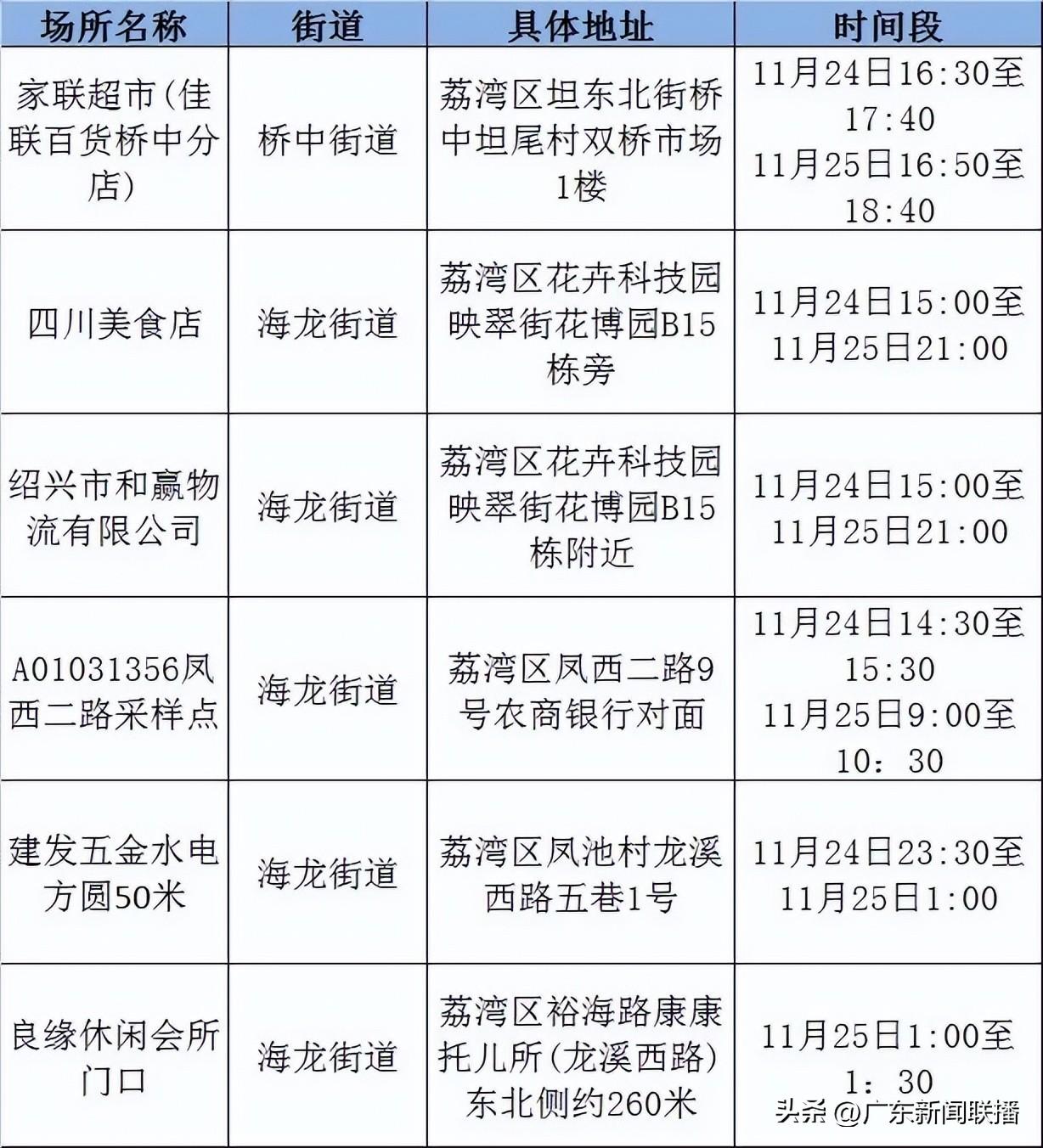到過以下重點(diǎn)場所的人員請立即報(bào)備并進(jìn)行核酸檢測因疫情防控需要,請?jiān)谙嚓P(guān)時(shí)段到過荔灣區(qū)下述重點(diǎn)場所的人員,立即向所在社區(qū)聯(lián)系報(bào)備,開展“三天三檢”自我健康監(jiān)測,期間非必要不外出、不聚集、不聚餐、不乘坐公共交通工具,同時(shí)按照社區(qū)和疾控部門的要求配合做好健康管理。重點(diǎn)場所名單后續(xù)將按實(shí)際情況更新。