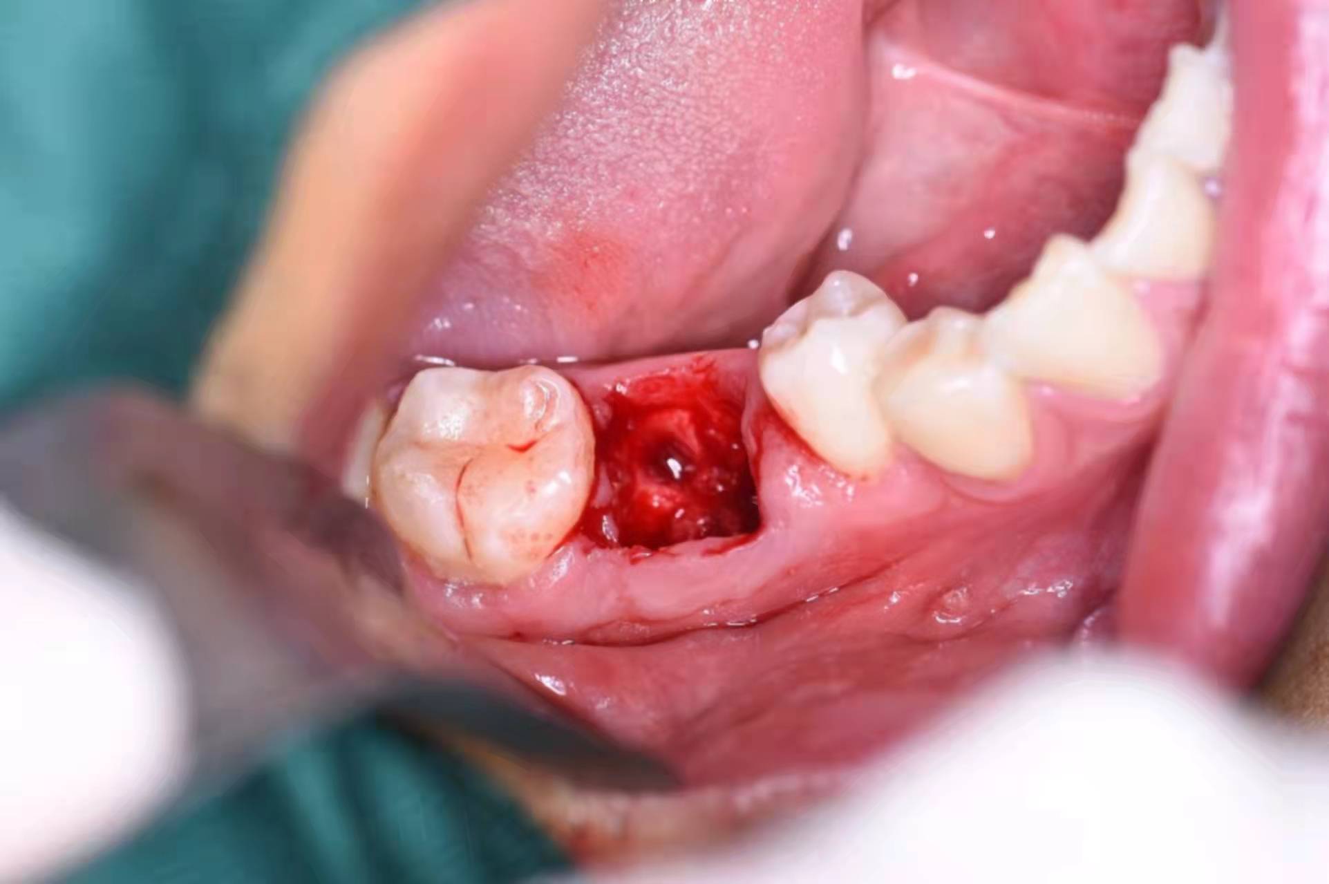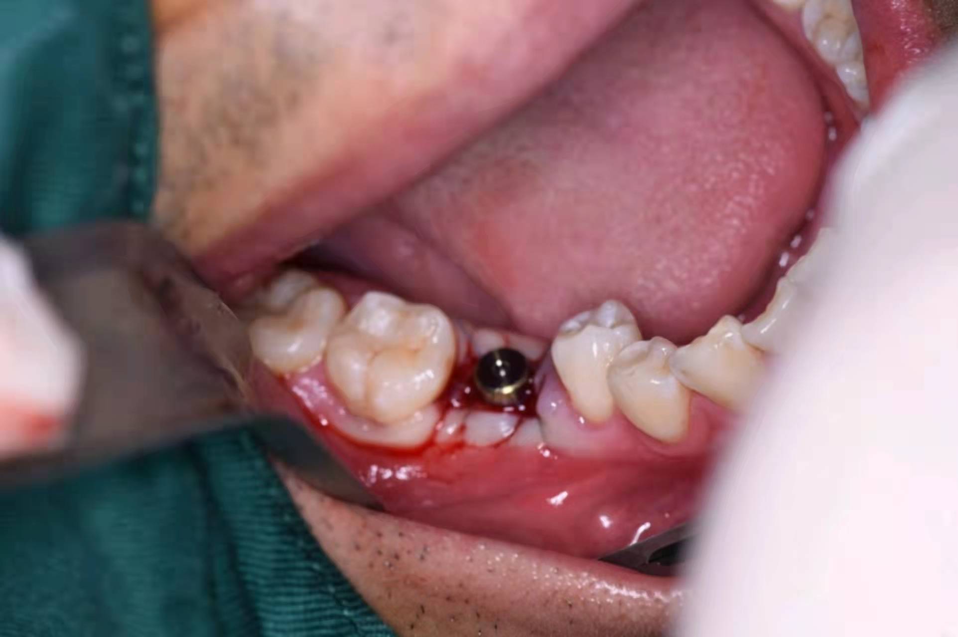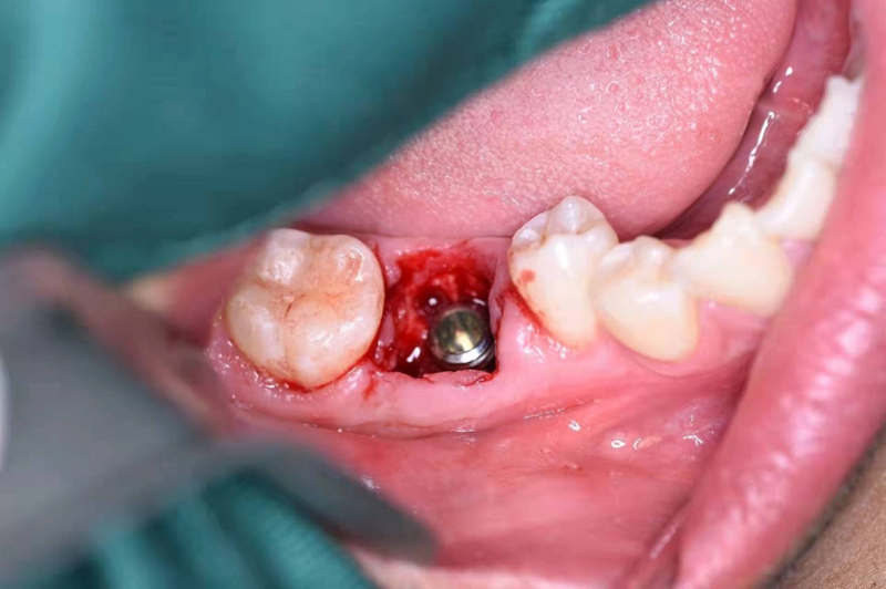 將牙齦切開一個小口,翻開之后,在暴露的牙骨上,將種植體旋入到牙槽窩內。