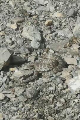 據(jù)了解,8月15日,幾名驢友在青沙山附近游玩時,忽然發(fā)現(xiàn)路邊亂石中間有一花紋繁復(fù)的圓盤。大家走近一看,發(fā)現(xiàn)竟然是一條蛇!由于蛇的膚色和石頭顏色相近,大家擔心過往路人可能會忽視此處有蛇,便想辦法將蛇驅(qū)趕走。同行的一名小伙已用登山杖將蛇挑離該區(qū)域。經(jīng)記者查實,該蛇為阿拉善蝮,有劇毒,希望過往游客多加注意。