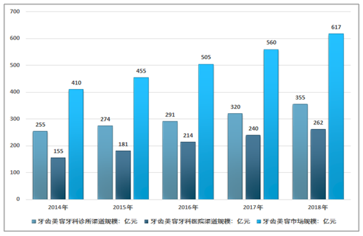 ◎ 我國牙齒美容市場規(guī)??焖僭鲩L,從2014年的410億元增長到了2018年的617億元,年均增速超過11%。/ 智研咨詢