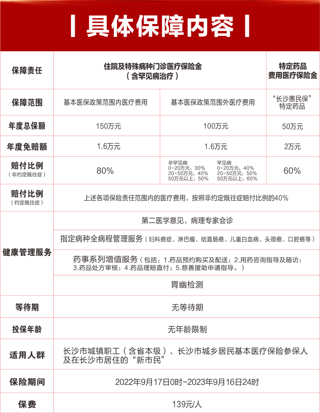 2022年“長沙惠民?!辈幌迲艏?,不限年齡,不限職業(yè),不限既往病史。只要是長沙市城鎮(zhèn)職工(含省本級(jí))、長沙市城鄉(xiāng)居民基本醫(yī)療保險(xiǎn)參保人及在長沙市居住的“新市民”均可參保!