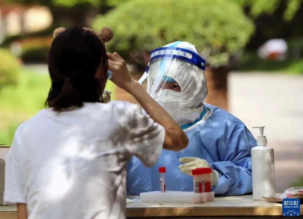 4月12日,在上海松江區(qū)一居民小區(qū)內(nèi),醫(yī)務(wù)人員進行核酸檢測采樣。新華社記者 劉穎 攝