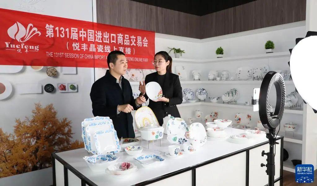 4月15日,第131屆中國進出口商品交易會線上開幕。在江蘇省淮安市洪澤區(qū),一家陶瓷企業(yè)的工作人員在展廳直播介紹產(chǎn)品。新華社發(fā)(趙啟瑞 攝)