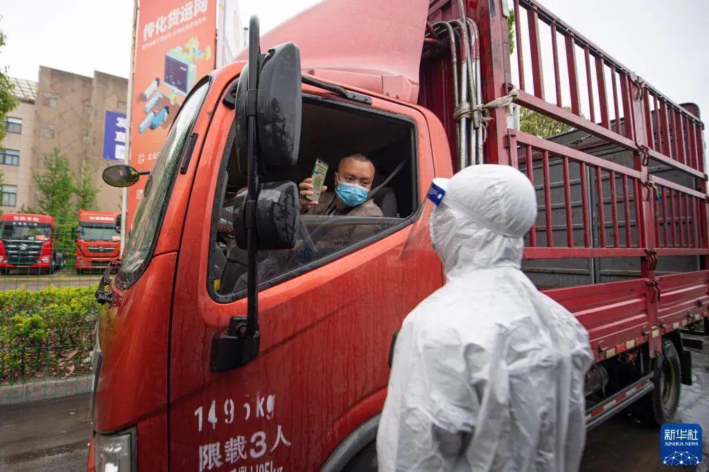 4月13日,工作人員查驗駛?cè)牒贾輦骰犯鄣呢涇囁緳C健康碼。新華社記者 江漢 攝