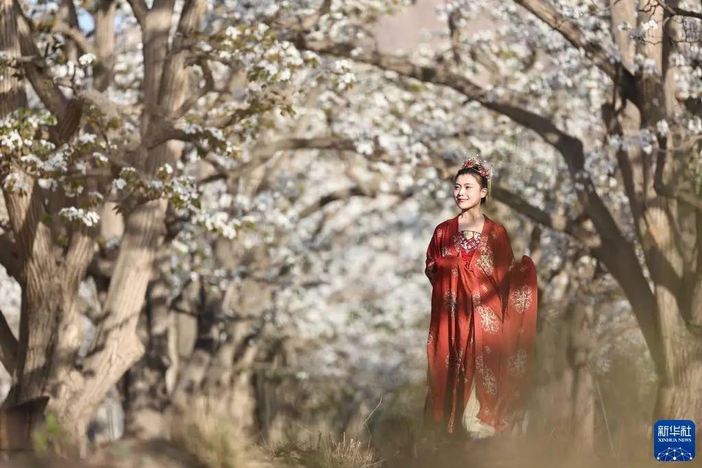 4月7日,景區(qū)工作人員在甘肅省蘭州市皋蘭縣什川鎮(zhèn)百年梨園內(nèi)進行表演。受疫情影響,景區(qū)組織工作人員在梨園內(nèi)直播,邀請人們“云賞花”,滿足公眾賞花需求。新華社記者 陳斌 攝