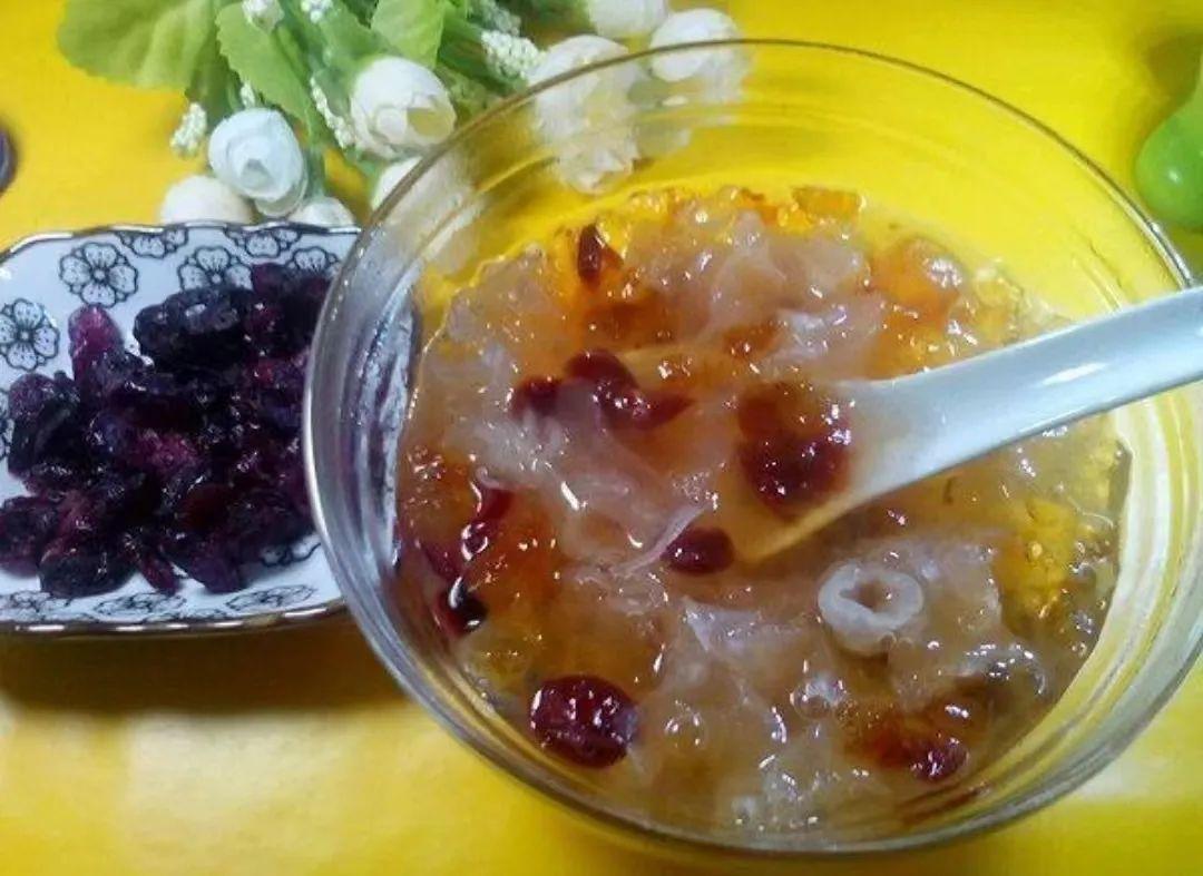 食材:銀耳180g、桃膠150g、枸杞15g、紅棗35g、百合25g、水2.5L、冰糖70g