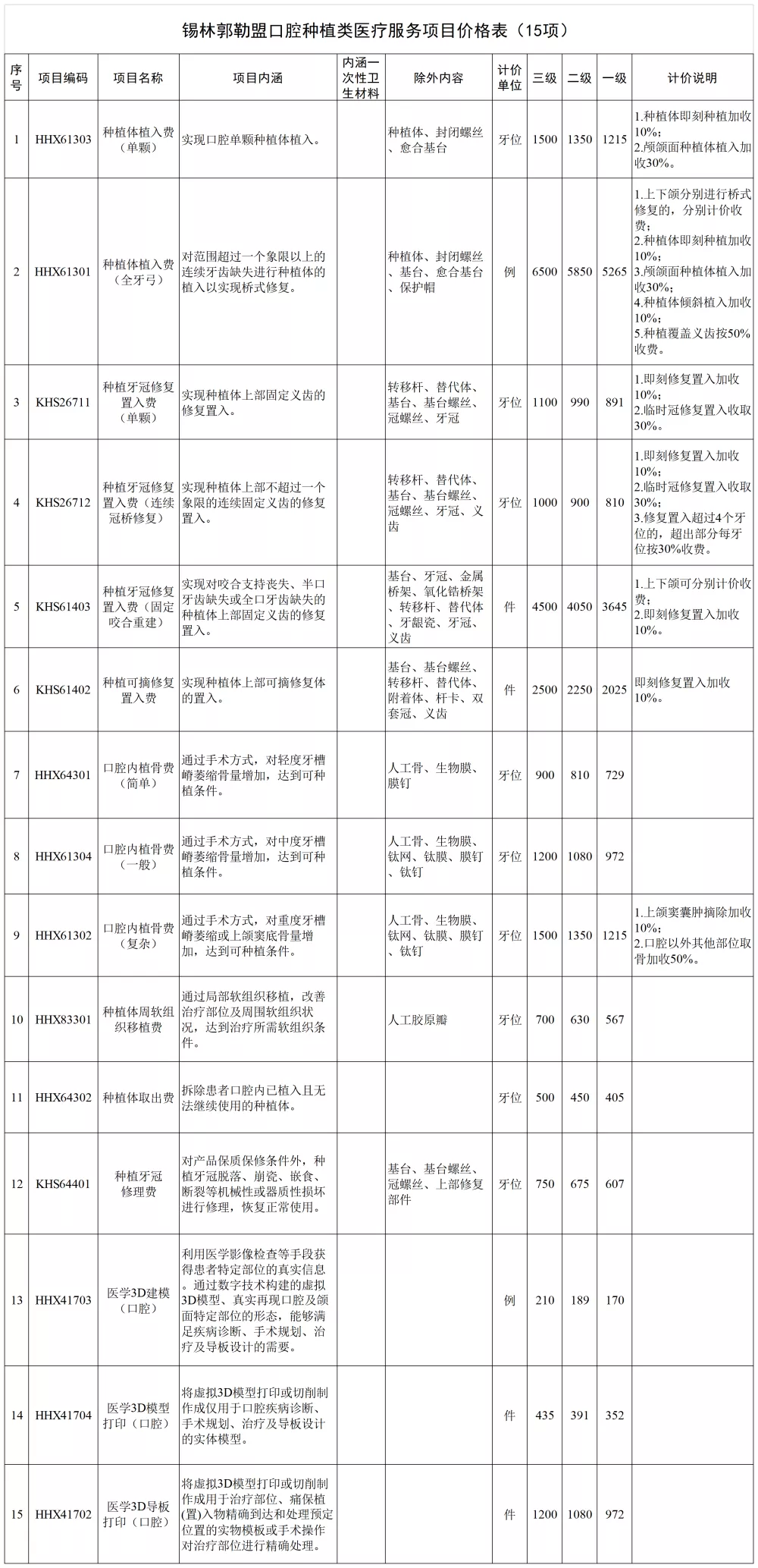 按照自治區(qū)醫(yī)療保障局部署,經(jīng)開展調(diào)研、成本核算和專家論證,盟醫(yī)療保障局印發(fā)通知,統(tǒng)一規(guī)范整合我盟口腔種植類醫(yī)療服務(wù)項(xiàng)目價格,其中:單顆常規(guī)口腔種植牙醫(yī)療服務(wù)價格全流程調(diào)控目標(biāo)為3570元,包括種植牙的診查費(fèi)、生化檢驗(yàn)費(fèi)、影像檢查費(fèi)、種植體植入費(fèi)、牙冠置入費(fèi)、掃描設(shè)計建模費(fèi)、麻醉費(fèi)、藥品費(fèi)用總和。