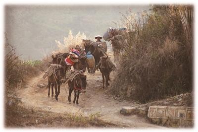 馬幫第一次出門的情形,爺爺記得清晰,因為那是爺爺一輩子值得驕傲的一天。那天清晨,爺爺起了個大早,給騾子添加草料和水,奶奶也起來給大家做早飯。馬幫的成員到齊后爺爺做了后的要求,大家吃過早飯整理好鞍架,安排好騾子順序,準備出發(fā)。爺爺帶大家燒了紙錢,磕過頭,給頭騾掛上新縫制的火紅色粗花籠和大馬鈴,給二騾掛上淺紅色的細花籠和小馬鈴,每家給自己的騾子放好鞍架,爺爺重重地敲了一下馬鈸,大聲喊道:出門了。大家附和著:出門了。騾隊按順序走出蔣家大院。馬幫從村中間的大道穿寨而過,那大馬鈴聲的低沉厚重,隨著騾子腳步混響著小馬鈴聲的清脆悅耳,再配上爺爺有節(jié)律的馬鈸聲,簡直就是村里一首美妙的馬幫交響曲,在村子里久久回響。村里的鄉(xiāng)親都出來看熱鬧,大家指指點點,不停發(fā)出嘖嘖贊嘆,羨慕的目光在馬隊間交織著,馬幫里的每一個人都被自豪的情緒包圍著。