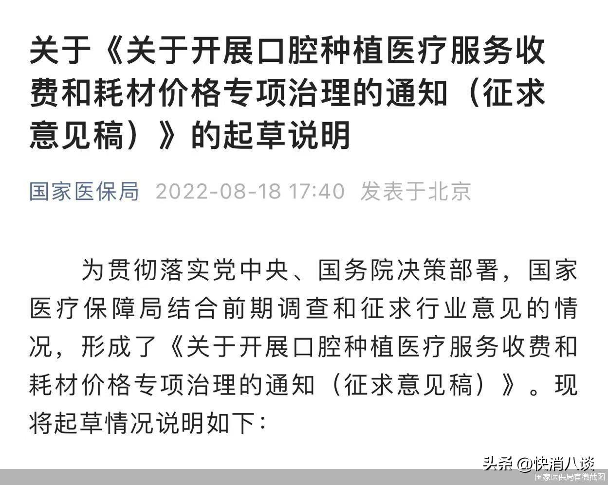 8月18日,醫(yī)療保障局就《關(guān)于開展口腔種植醫(yī)療服務(wù)收費(fèi)和耗材價(jià)格專項(xiàng)治理的通知(征求意見稿)》(以下簡稱《意見稿》)公開征求意見?!兑庖姼濉窂囊龑?dǎo)種植牙牙冠形成合理價(jià)格,到規(guī)范整合口腔種植價(jià)格項(xiàng)目等十二個(gè)方面面向社會(huì)公開征求意見,截止時(shí)間為2022年8月27日。長期以來,口腔種植領(lǐng)域收費(fèi)不規(guī)范、費(fèi)用負(fù)擔(dān)重,成為困擾群眾的民生痛點(diǎn)。隨著《意見稿》的披露,種植牙集采箭在弦上。