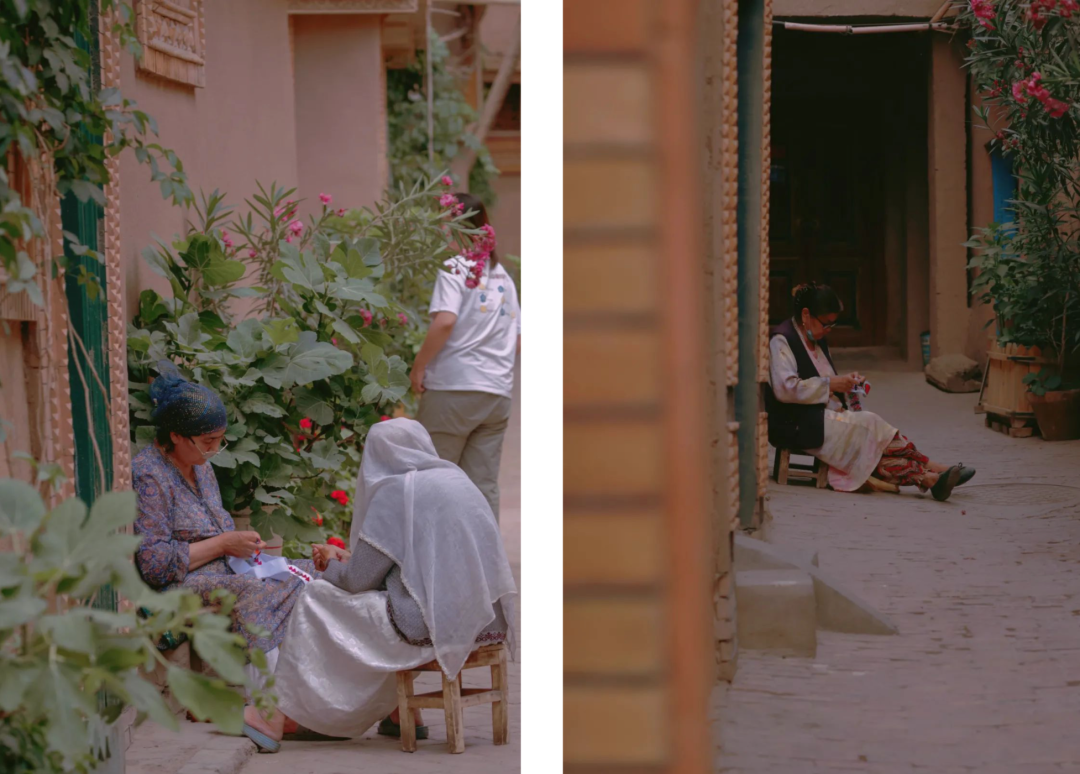 維吾爾族老大爺們愛(ài)聚在一起喝茶聊天,而維吾爾族的阿姨們都統(tǒng)一坐在自家門口做針線活兒。