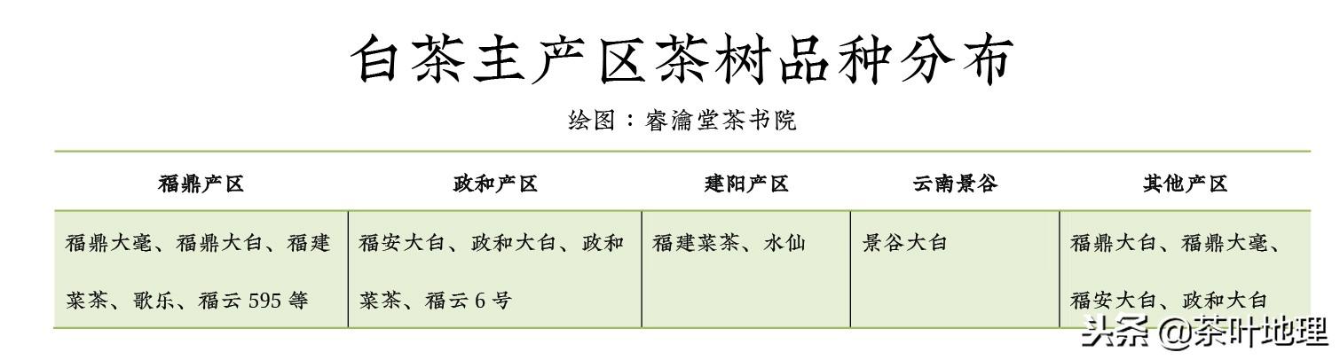 福鼎產(chǎn)區(qū)的白茶樹種以福鼎大白、福鼎大毫為主,有福建菜茶、歌樂、福云595等品種有零星分布;政和產(chǎn)區(qū)的白茶樹種以福安大白、政和大白、小菜茶為主;福云6號有零星分布;建陽產(chǎn)區(qū)的白茶樹種以小菜茶、水仙品種為主;其他產(chǎn)區(qū)的白茶樹種也大致相似,歸納起來用這樣的一個表格可以看的更清晰: