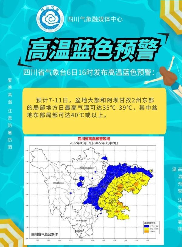 與此同時(shí),6日下午,四川省氣象臺(tái)也發(fā)布了高溫藍(lán)色預(yù)警:預(yù)計(jì)7-11日,盆地大部和阿壩甘孜2州東部的局部地方日高氣溫可達(dá)35℃-39℃,其中盆地東部局部可達(dá)40℃或以上。