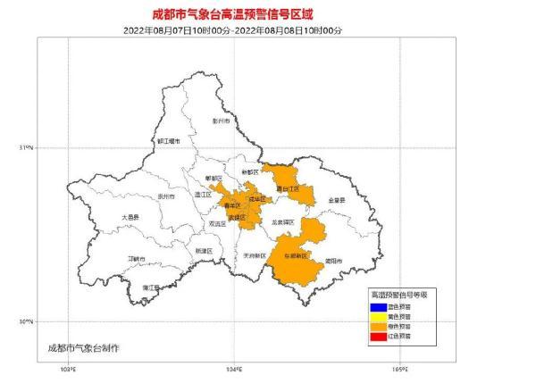 成都市氣象臺(tái)2022年08月07日10時(shí)00分發(fā)布高溫橙色預(yù)警信號(hào):預(yù)計(jì)我市東部新區(qū)、錦江區(qū)、青羊區(qū)、武侯區(qū)、成華區(qū)、金牛區(qū)、高新南區(qū)、高新西區(qū)和青白江區(qū)的全部鎮(zhèn)(街道)未來24小時(shí)內(nèi)高氣溫將升至35℃以上,35℃以上高溫主要出現(xiàn)在12時(shí)至18時(shí)。請(qǐng)注意防暑降溫。