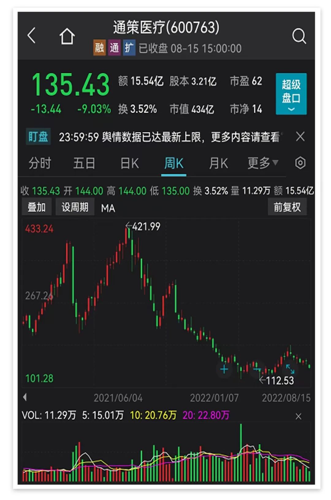 8月15日,有“牙茅”之稱的通策醫(yī)療低開低走,收盤大跌9.03%,股價報135.43元/股。