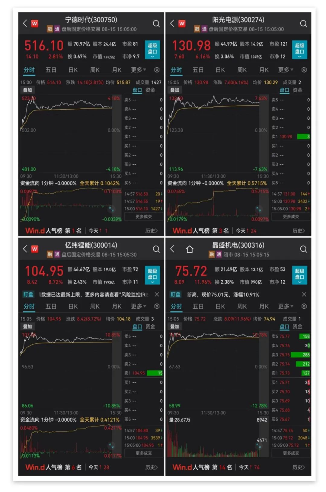 截至收盤,寧德時代上漲2.81%,市值達(dá)12596億元;晶盛機(jī)電上漲11.96%,億緯鋰能上漲8.72%,陽光電源上漲6.16%。