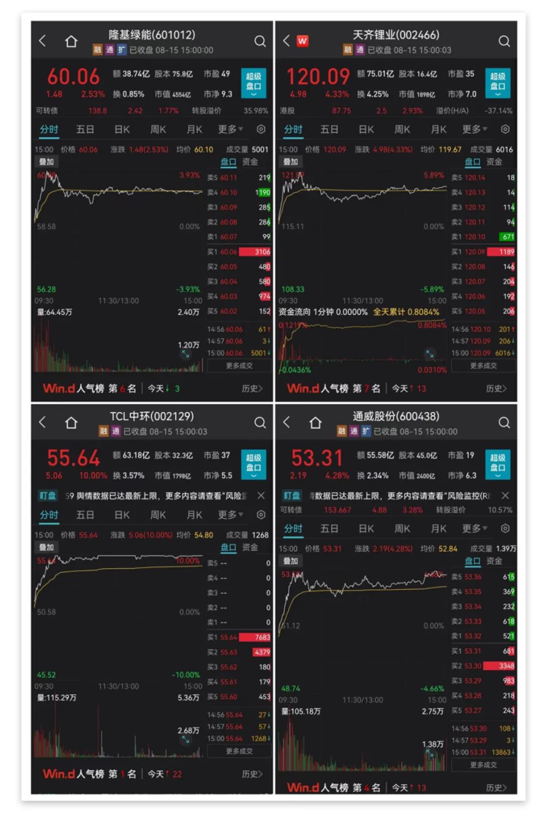 截至收盤,“光伏茅”隆基綠能上漲2.53%,通威股份上漲4.28%,天齊鋰業(yè)上漲4.33%,TCL中環(huán)漲停,合盛硅業(yè)大漲逾9%,晶澳科技、贛鋒鋰業(yè)漲幅均超過2%。