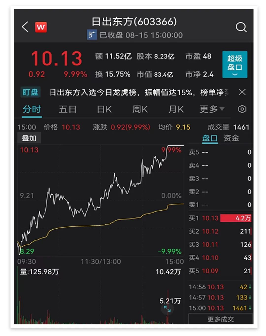 日出東方早盤一度觸及跌停,午后則大幅拉升,尾盤漲停,上演“地天板”,收報10.13元/股,市值83億元,成交額超11億元。