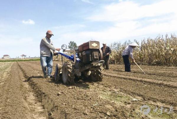 村民殷漢芳正組織機械進行翻地。