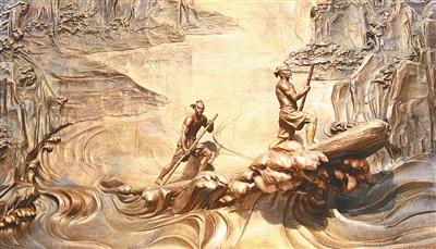 序廳設(shè)在一樓大廳,面積近800平方米,直達(dá)二層頂部,是博物館的一個(gè)亮點(diǎn)。高度17.8米,寬度14.3米,面積255平方米的大型銅雕《甌江長(zhǎng)歌》雄踞大廳,成為序廳的主體和視覺焦點(diǎn)?!懂T江長(zhǎng)歌》以麗水母親河甌江為主線,采用大寫意手法,以層次分明的高浮雕形式,擷取山勢(shì)險(xiǎn)峻、景色優(yōu)美的甌江特色風(fēng)光,融鳳陽(yáng)山、百山祖、仙都、廈河塔、甌江放木等獨(dú)特的麗水自然人文元素,濃縮展示了甌江兒女堅(jiān)韌不拔、奮勇向前的麗水精神。