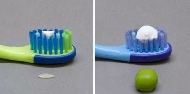 對于3歲以下的寶貝,家長要在孩子第一顆乳牙剛露頭就開始使用含氟牙膏幫助其刷牙。但用量需要嚴格控制,每次不能超過薄薄一層或者大米粒大小(約0.1g牙膏,約含0.1mg氟)(如下圖左)。