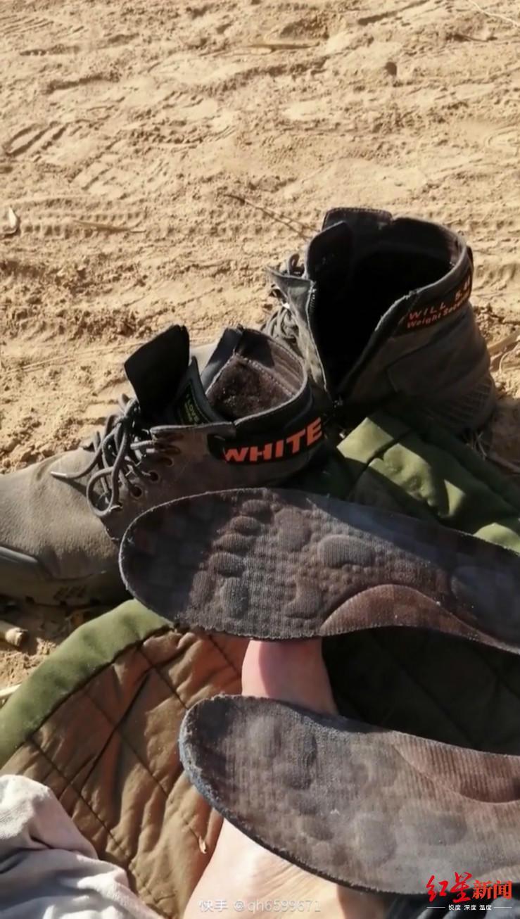 張先生途中休息時(shí)曬鞋墊 視頻截圖