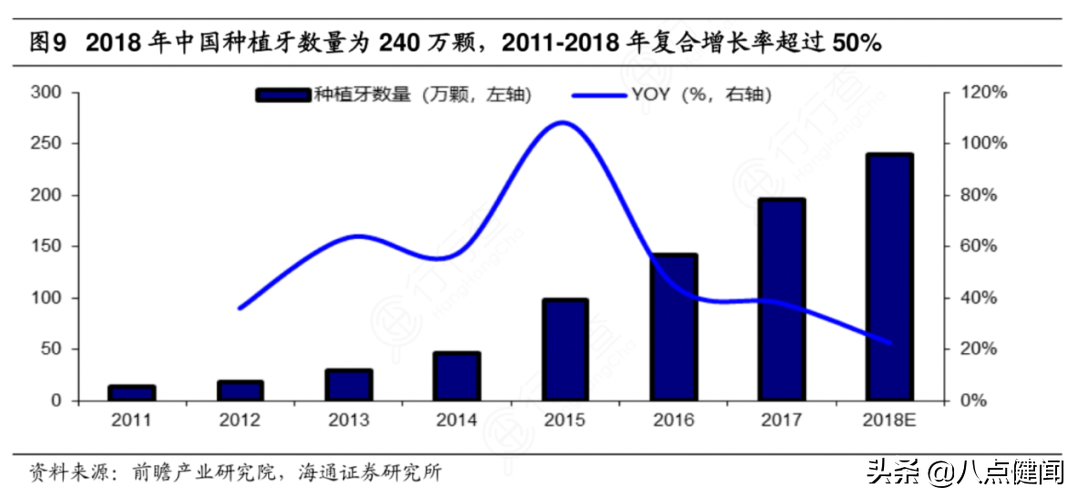 據(jù)研究機(jī)構(gòu)統(tǒng)計(jì),2018年中國(guó)種植牙數(shù)量為240萬(wàn)顆(約為2017年潛在缺牙數(shù)量的千分之一),2011~2018年,復(fù)合增長(zhǎng)率超過(guò)50%。這正是一個(gè)供不應(yīng)求,高速成長(zhǎng)的市場(chǎng)。