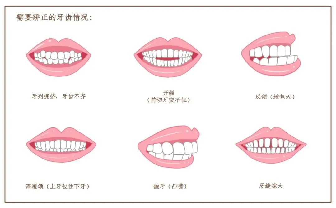 有以下牙齒問題的都需要做牙齒矯正:地包天、牙齒不齊、齙牙虎牙、牙縫過大、中縫不齊、牙齒開頜、牙列擁擠。尤其是地包天問題,一定要盡早矯正。